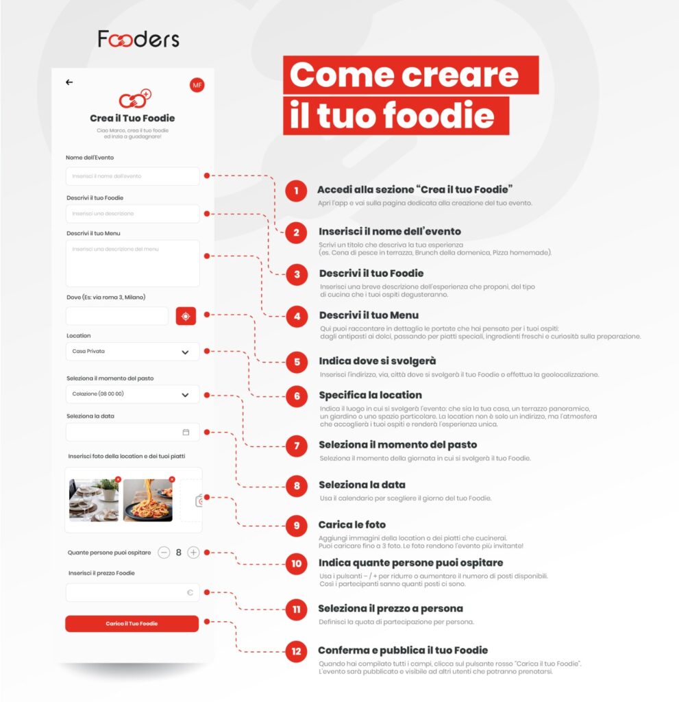 Con Fooders puoi accogliere ospiti reali a casa tua, offrendo esperienze culinarie autentiche, creative o raffinate. Dal ragù della domenica al menù degustazione, passando per specialità vegetariane o grigliate saporite, ogni passione trova il suo spazio.
